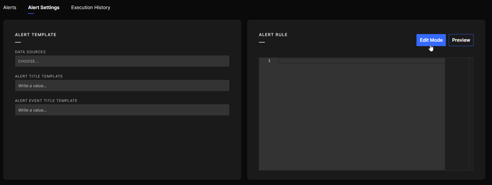 Step 1 Go to the Rule definition tab of the Alert Rule you want to set up, and click on Edit Mode to start programming: