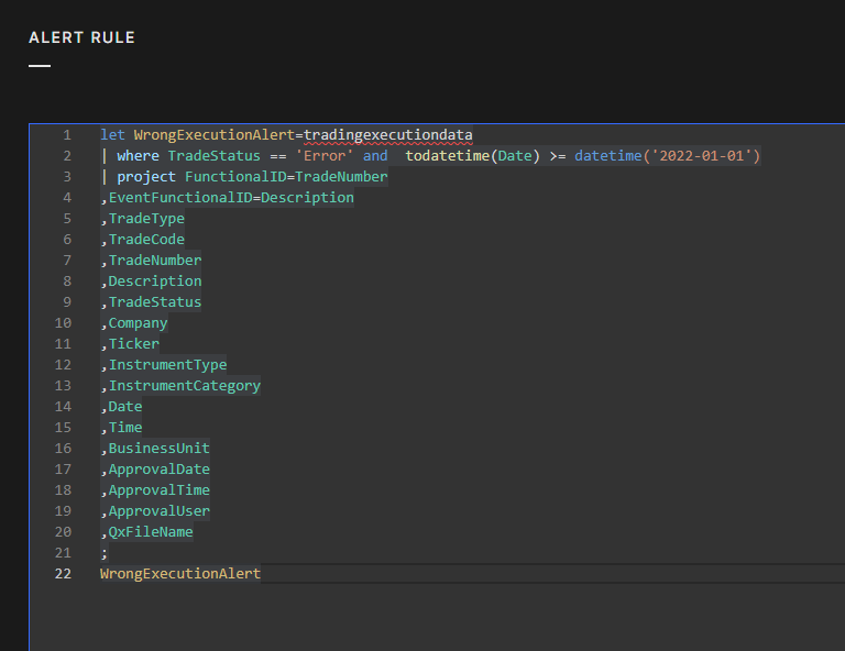 {fieldname}). - Alert Rule: this is where you type the query that will generate custom alerts. Please refer to the Alert Rule (KQL query) section and the KQL primer to learn more about KQL programming.