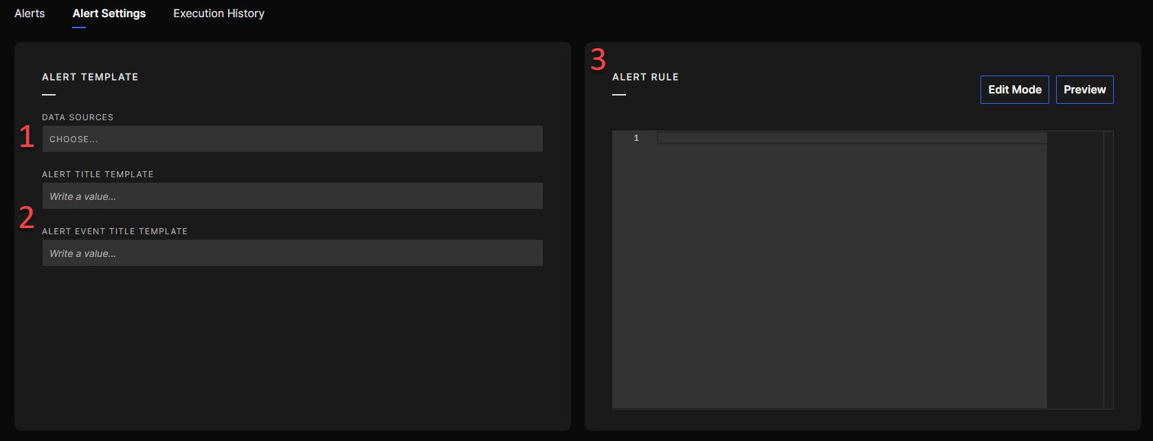 - Alert Title Templates: these fields will establish the format of the titles for the future alerts and the alert events they contain. The titles can refer to field names from your Alert Rule configuration. You must write them between brackets to do so (