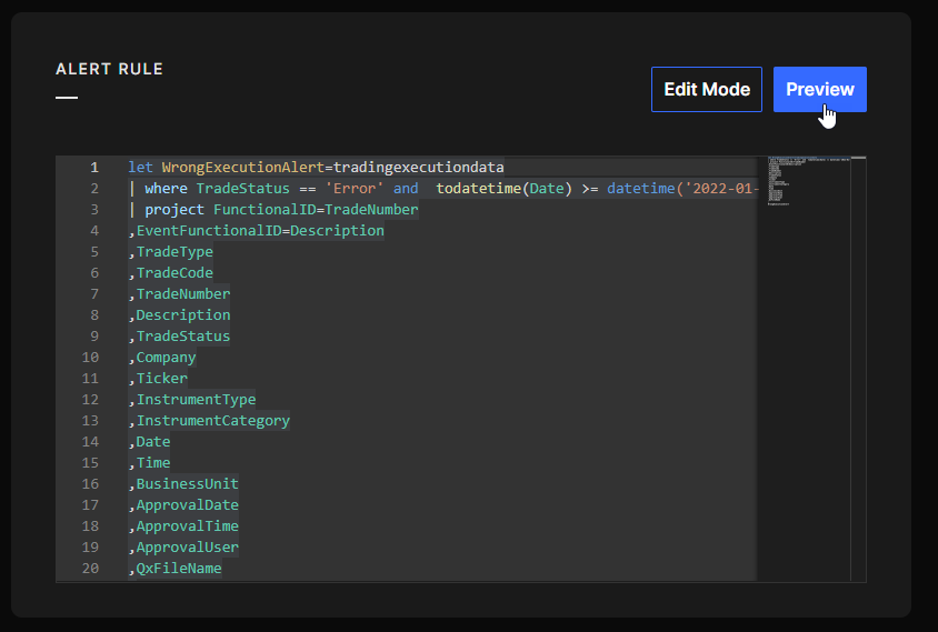 Step 3 Click on the Save button to confirm your query. The Preview will automatically execute to let you know if your query is working properly and give you a preview of the alert results. If it is, you can close the Edit Mode.