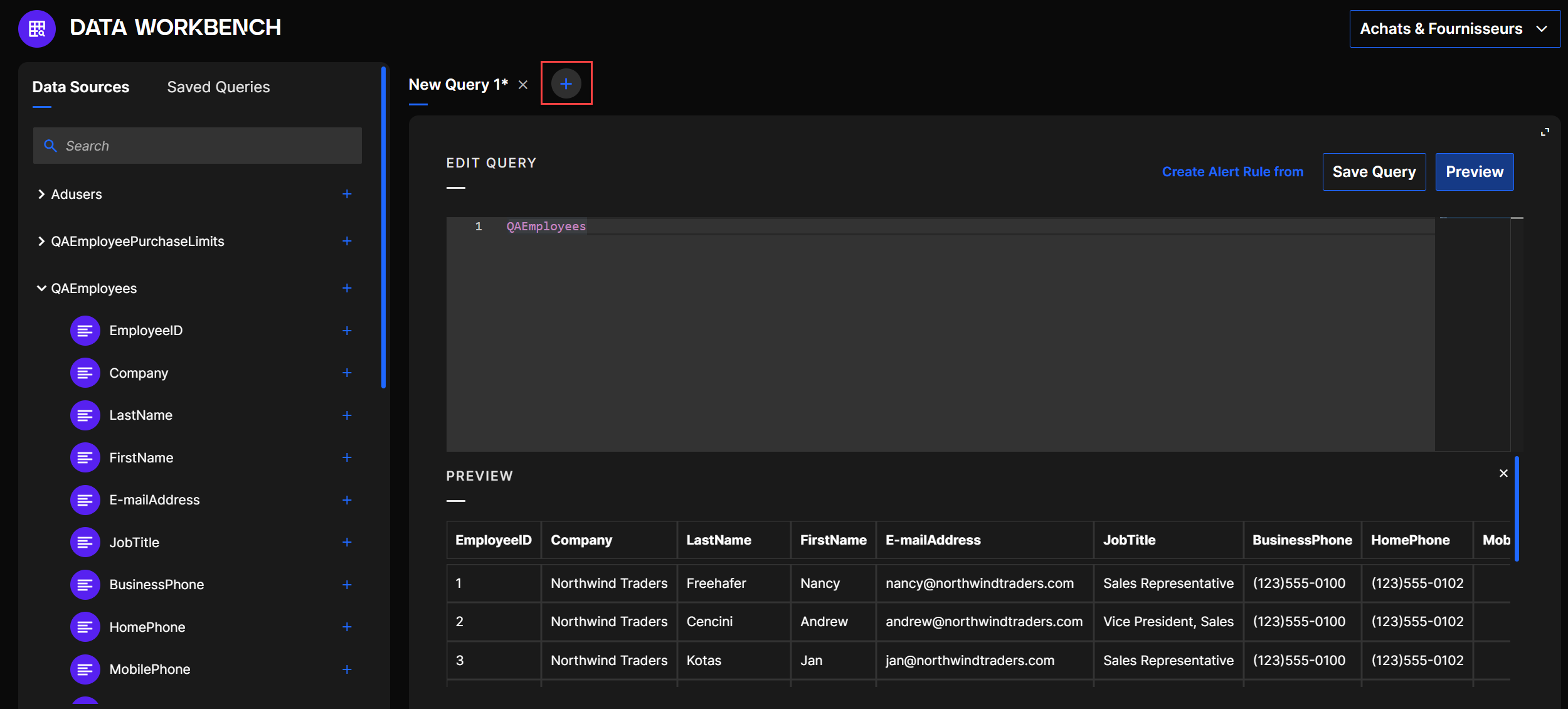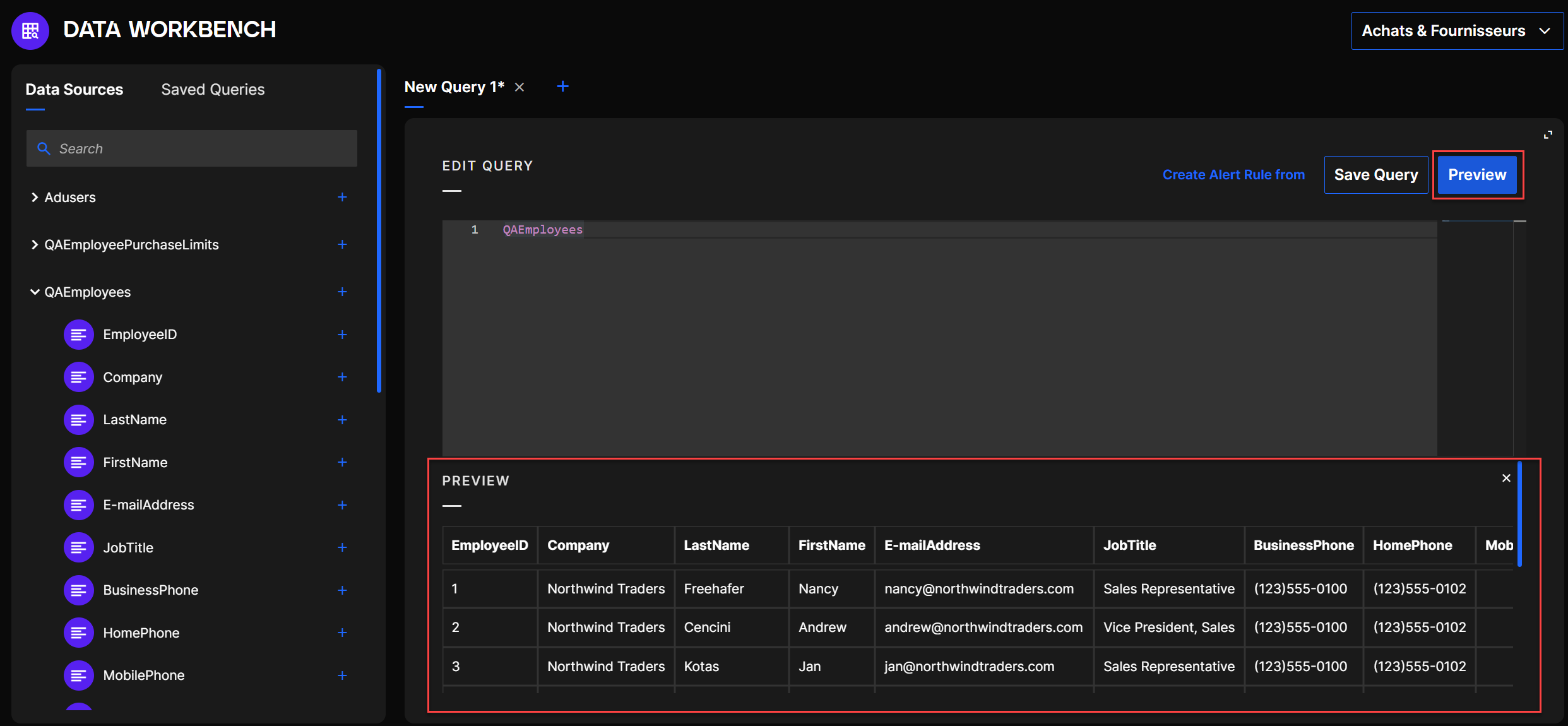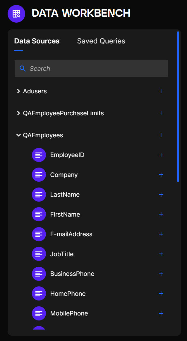 On the left of the screen, you have access to all authorized Data Sources within the Control Perimeter. The table names are displayed as well as the different fields/columns if you expand each section.