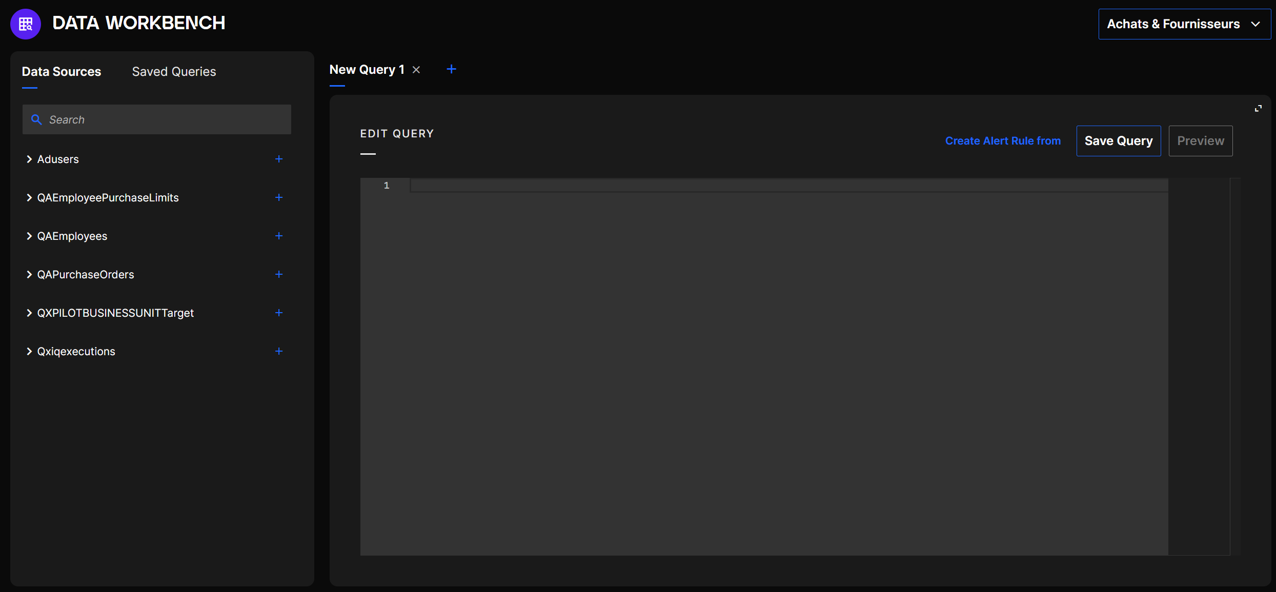 Navigate to the Data Workbench section in the side menu (you will only see this section if you are a Data Manager in at least one Control Perimeter). The context of the Data Workbench is the Control Perimeter. This means that the Data Sources and Saved Queries are only for the Control Perimeter you have select. By default, when navigating to the Data Workbench, you will automically be redirected in one of the Control Perimeters in which you are a Data Manager.