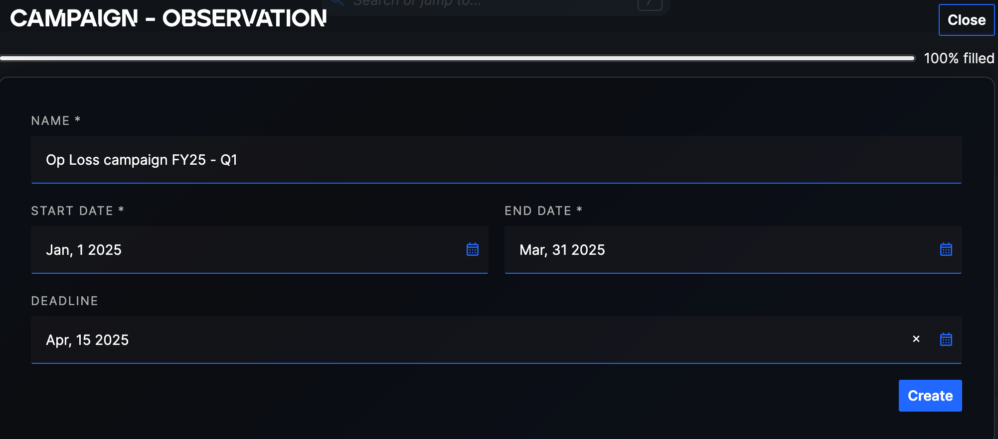 This will open up a modal where you will be able to define the criteria of the operational loss certification campaign :