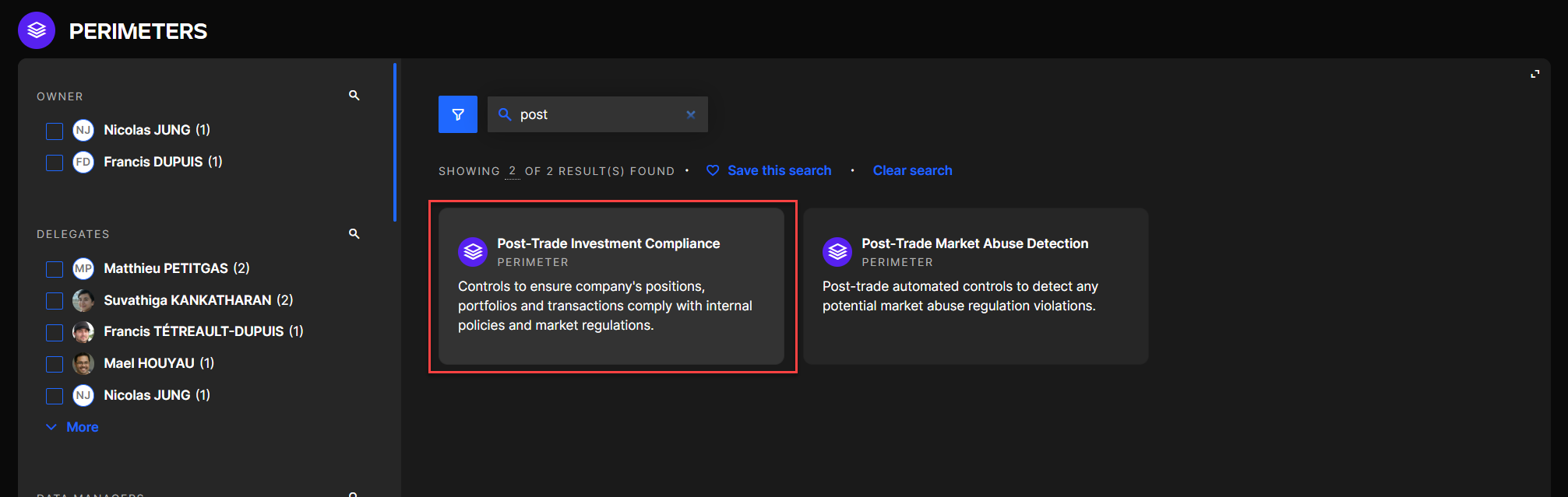 You can look for a specific Perimeter with preset criteria by using the filters or with keywords by using the search bar.
