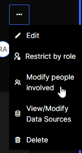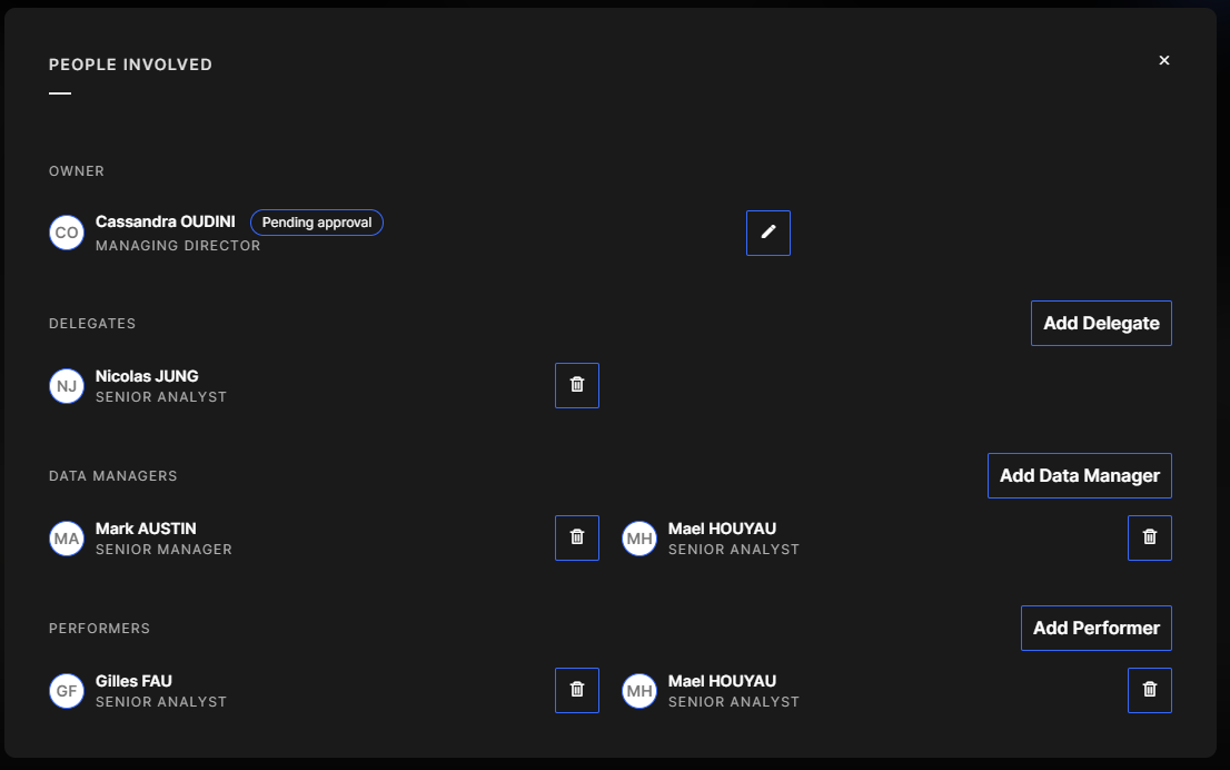 Once you click on the button, you can see the current Owner, Delegates, Data Managers and Performers, you can add or delete someone to/from this list, and you can see if some role change approvals are pending.