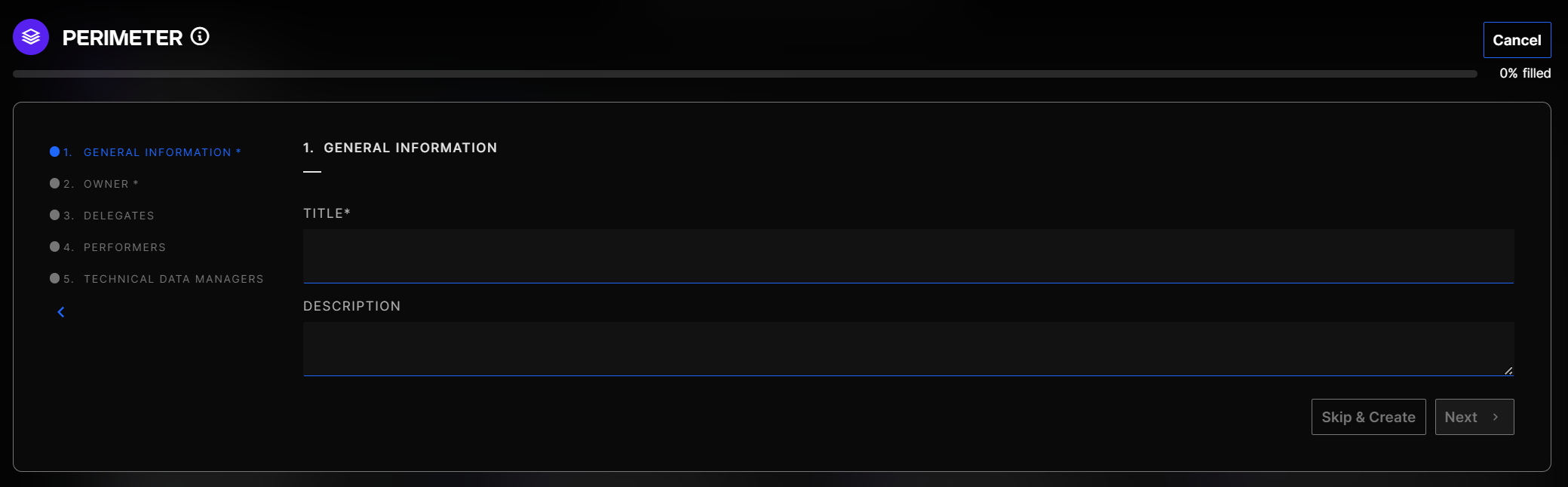 View all Perimeters Create a Perimeter View a Perimeter Modify people involved Add/modify data source