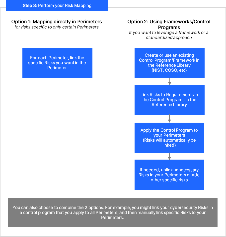 This is particularly useful if you want to use an existing Framework such as NIST, COBIT, COSO, or if you want to create your own internal framework with all your Risks. We usually recommend this approach if you want to apply a set of Risks to all your Perimeters.