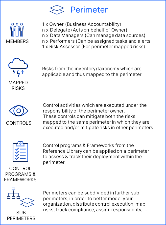 If you don't necessarily want to leverage an existing framework (NIST, COBIT, COSO, etc.) or create your own internal framework, you can directly map your Risks to your Perimeters.