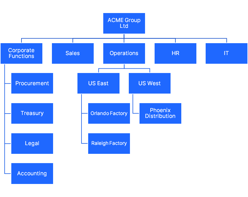 You can find an example of an organization below, each box representing a Perimeter.