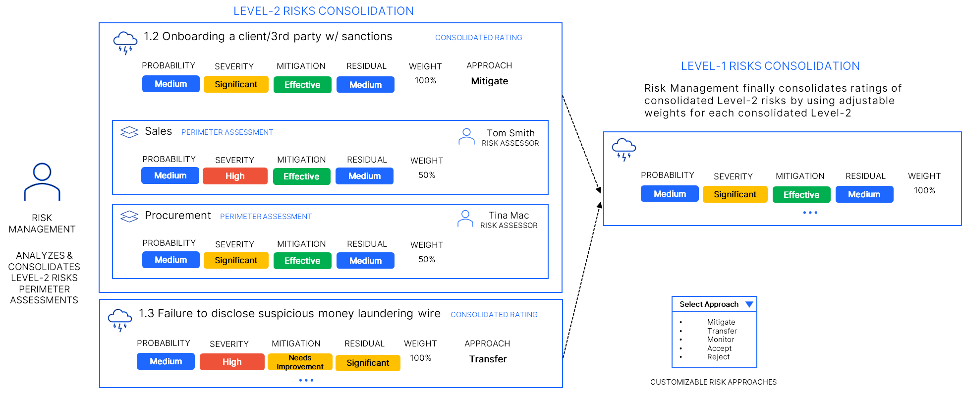 Risk Management then consolidates ratings for a specific Level-2 risk for the full organization by using adjustable weights for each perimeter in which it was assessed to average out ratings.