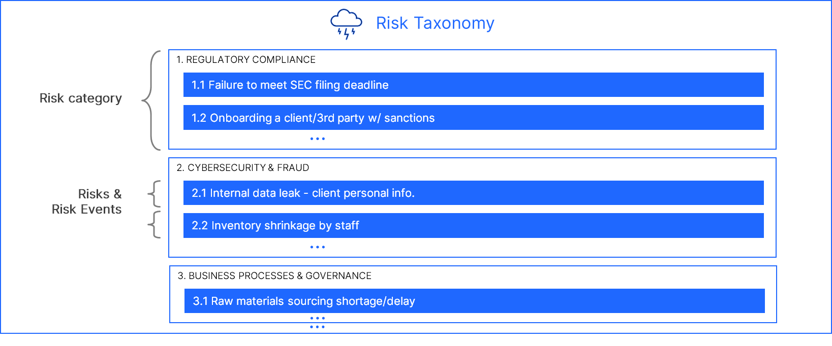 The next recommended step is to create your Risks Taxonomy/Registry. We recommend a 2-level Taxonomy with Risk Categories as level 1 and Risks/Risk Events as level 2.