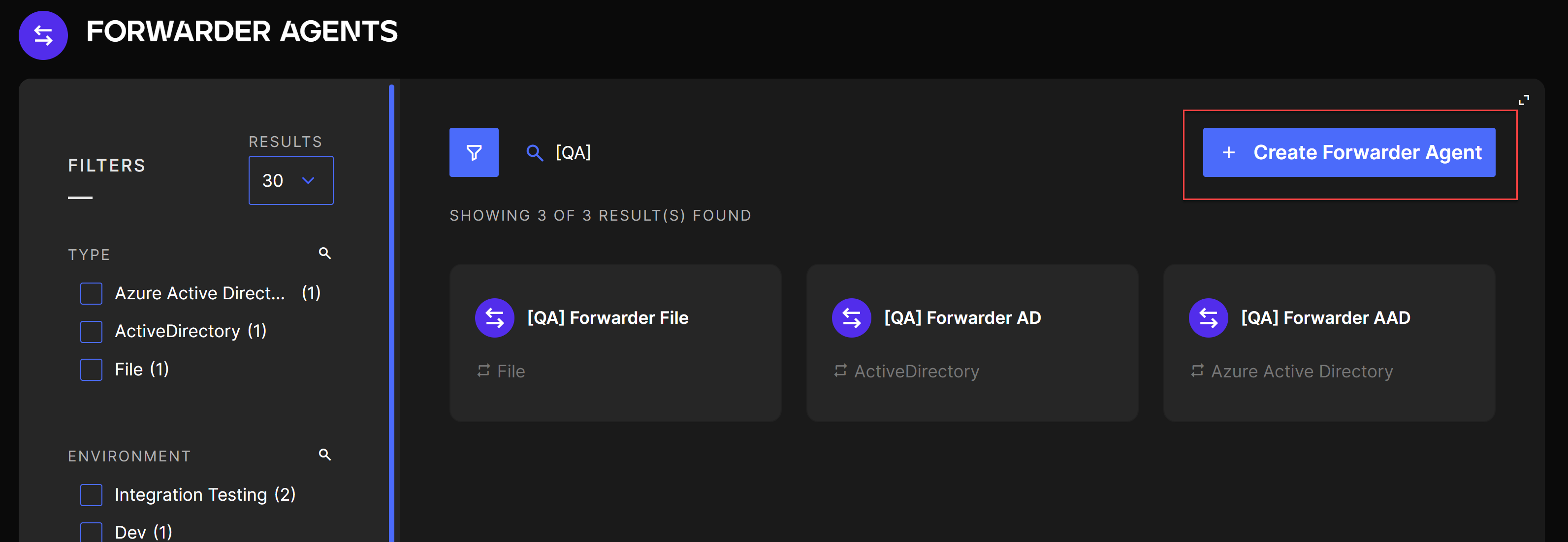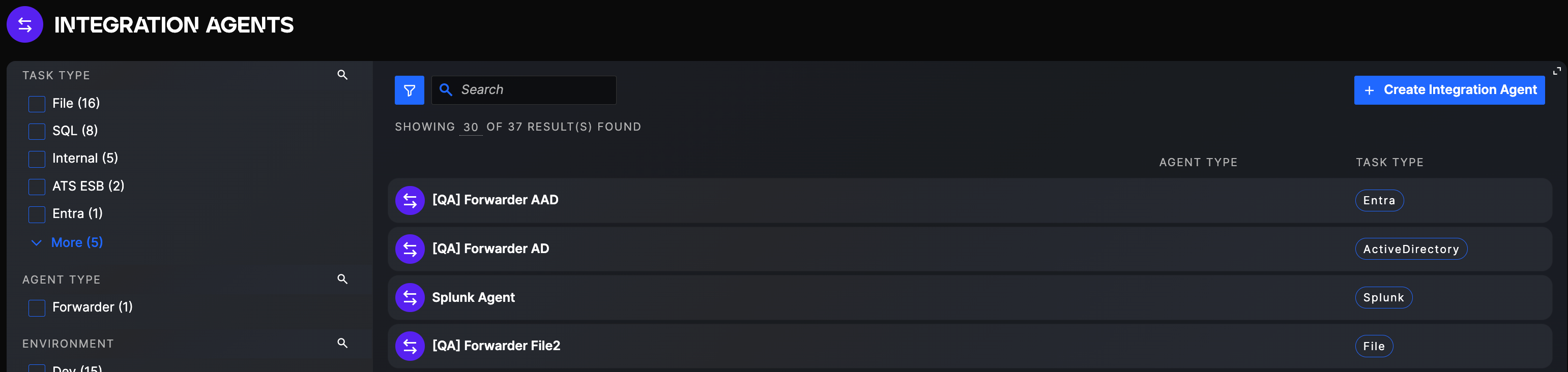 You should now see a list of all Integration Agents already configured in the application. You can also use filters to find a specific Integration Agent or use the search bar to search by name.