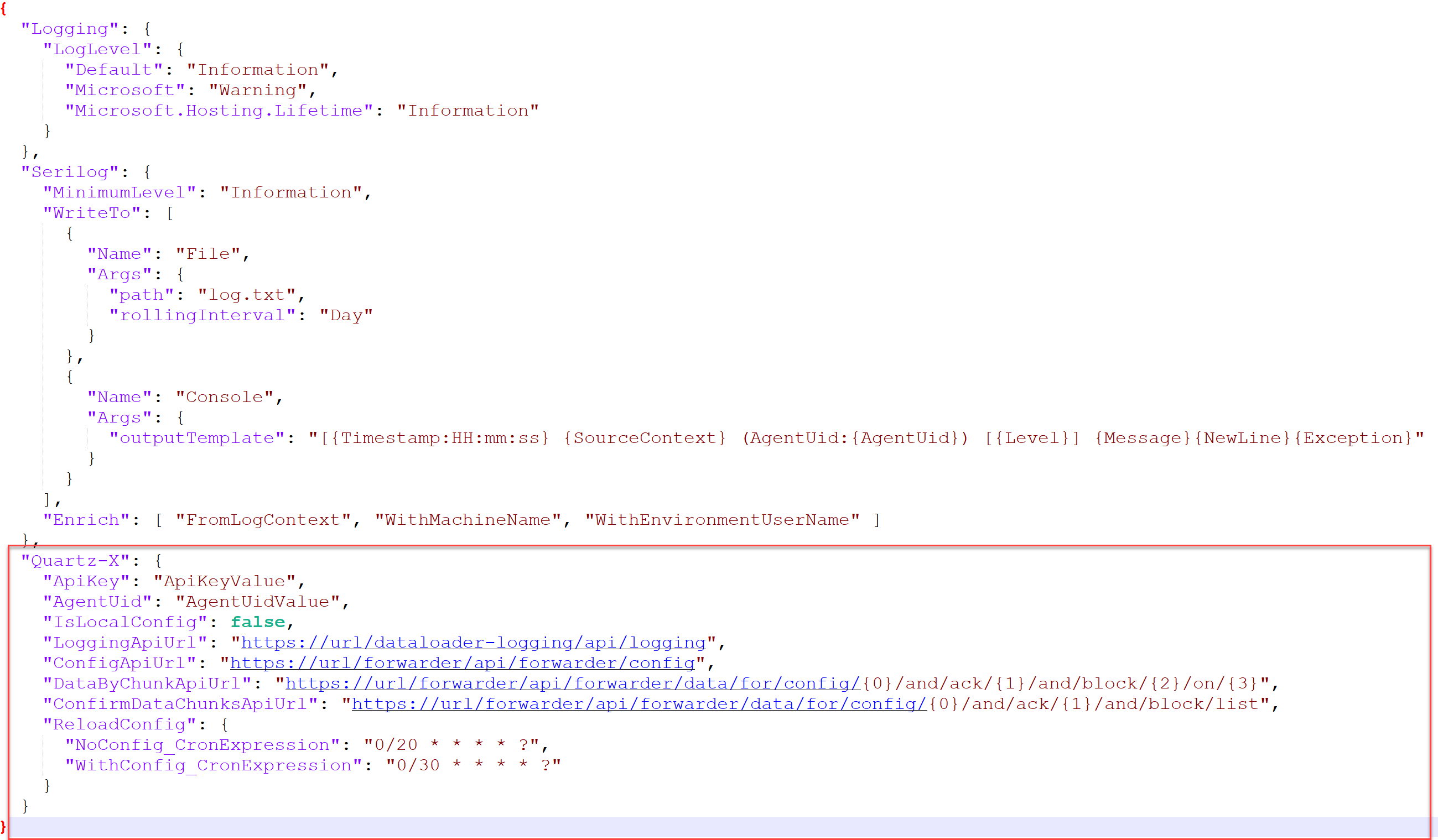 You will also need to change the different URLs that will be provided by our teams. Finally, you can also change the "ReloadConfig" section that allows you to configure, using a CRON format, the frequency at which the Integration Agent will try to retrieve Job Configurations in QuartzAdmin.