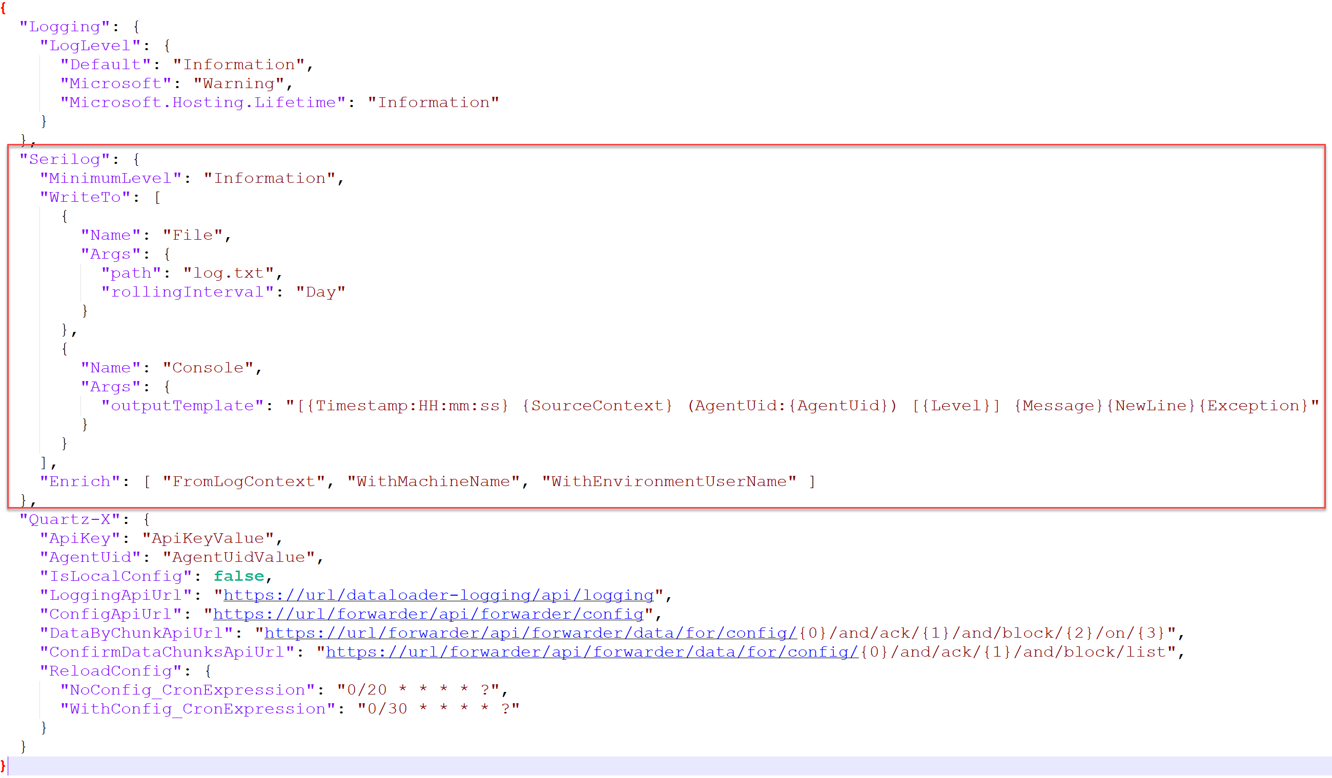 When opening the configuration file, you will have access to 2 sections that allow you to configure the logging of the Integration Agent. The first section "Logging" is a generic configuration for the logs. The section that you can configure is the "Serilog" section.