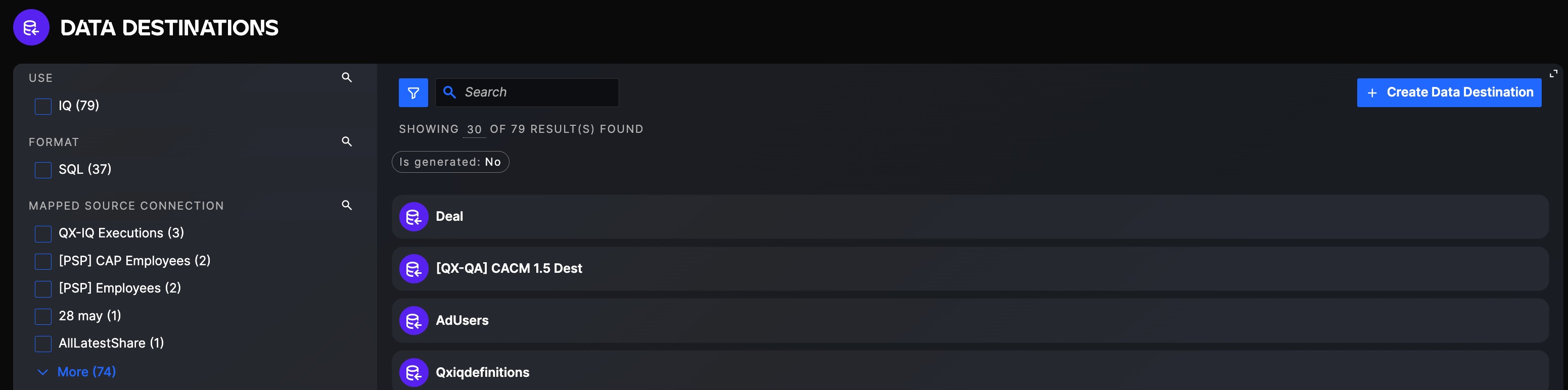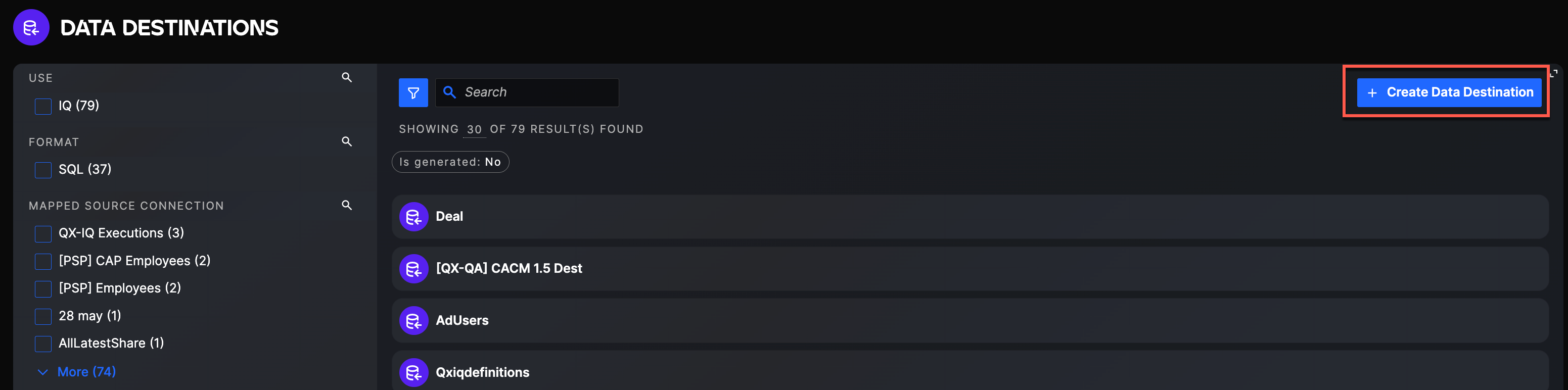 You should now see a list of all Data Destinations already configured in the application. You can also use filters to find a specific Data Destination or use the search bar to search by name.